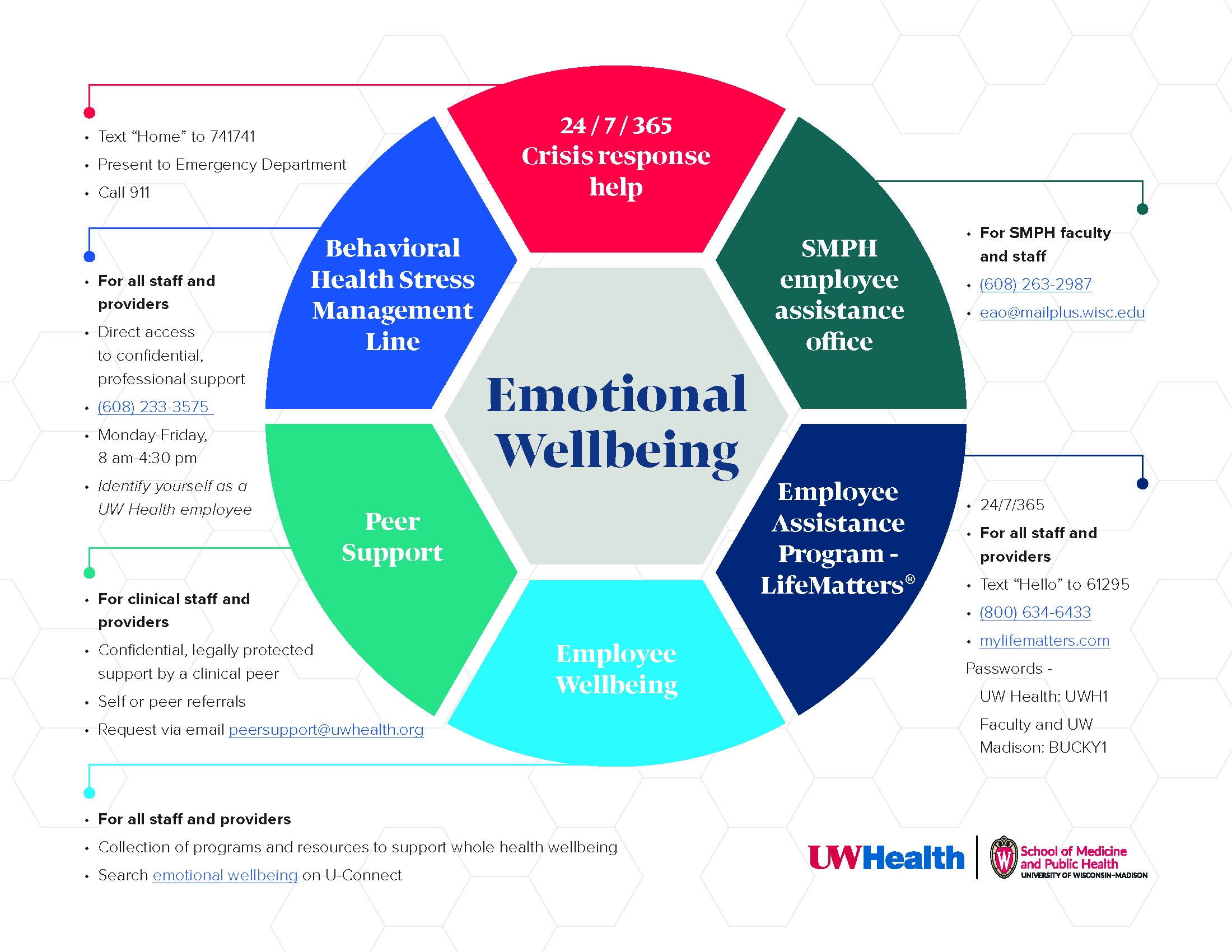 - Employee Assistance Program - LifeMatters®: Text “Hello” to 61295, call (800) 634-6433 or visit mylifematters.com (UW Health password: UWH1 Faculty; UW Madison password: BUCKY1)